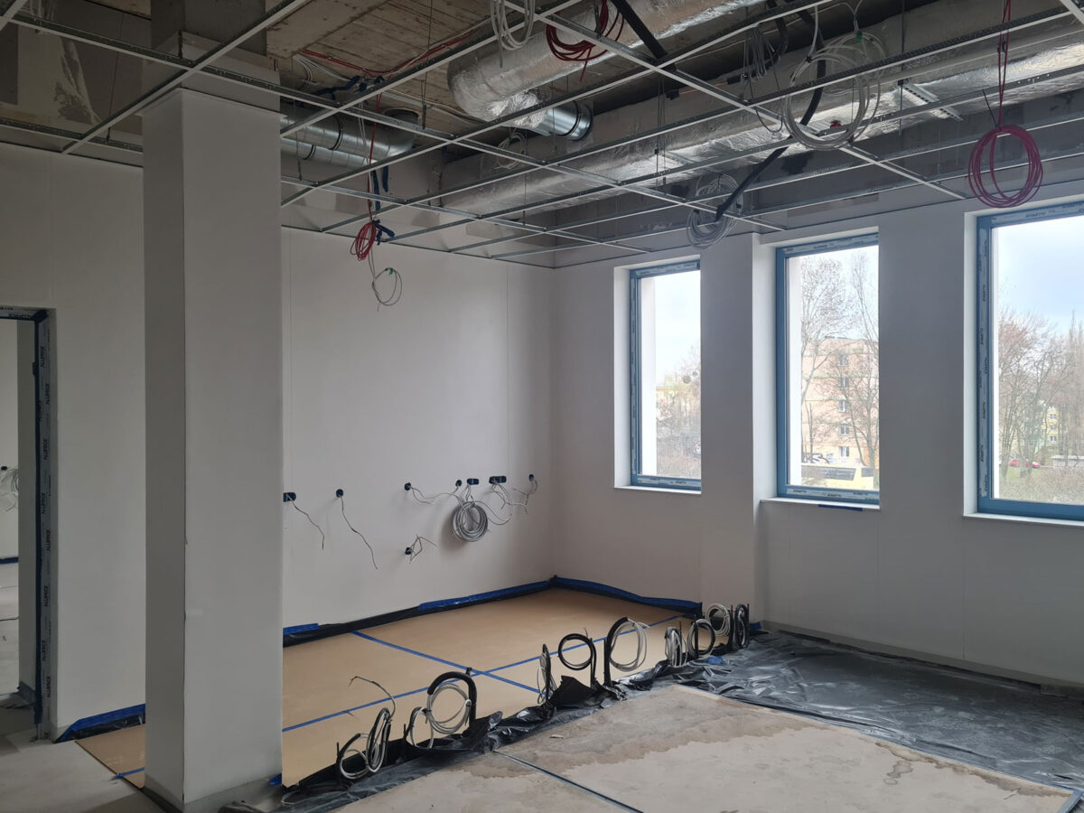 Montaż instalacji wentylacji mechanicznej, klimatyzacji, elektrycznej, teletechnicznej – przygotowanie do montażu technologii medycznej. Montaż elementów wykończeniowych, takich jak: płytki, wykładziny, malowanie, sufity podwieszane. Montaż stolarki wewnętrznej.