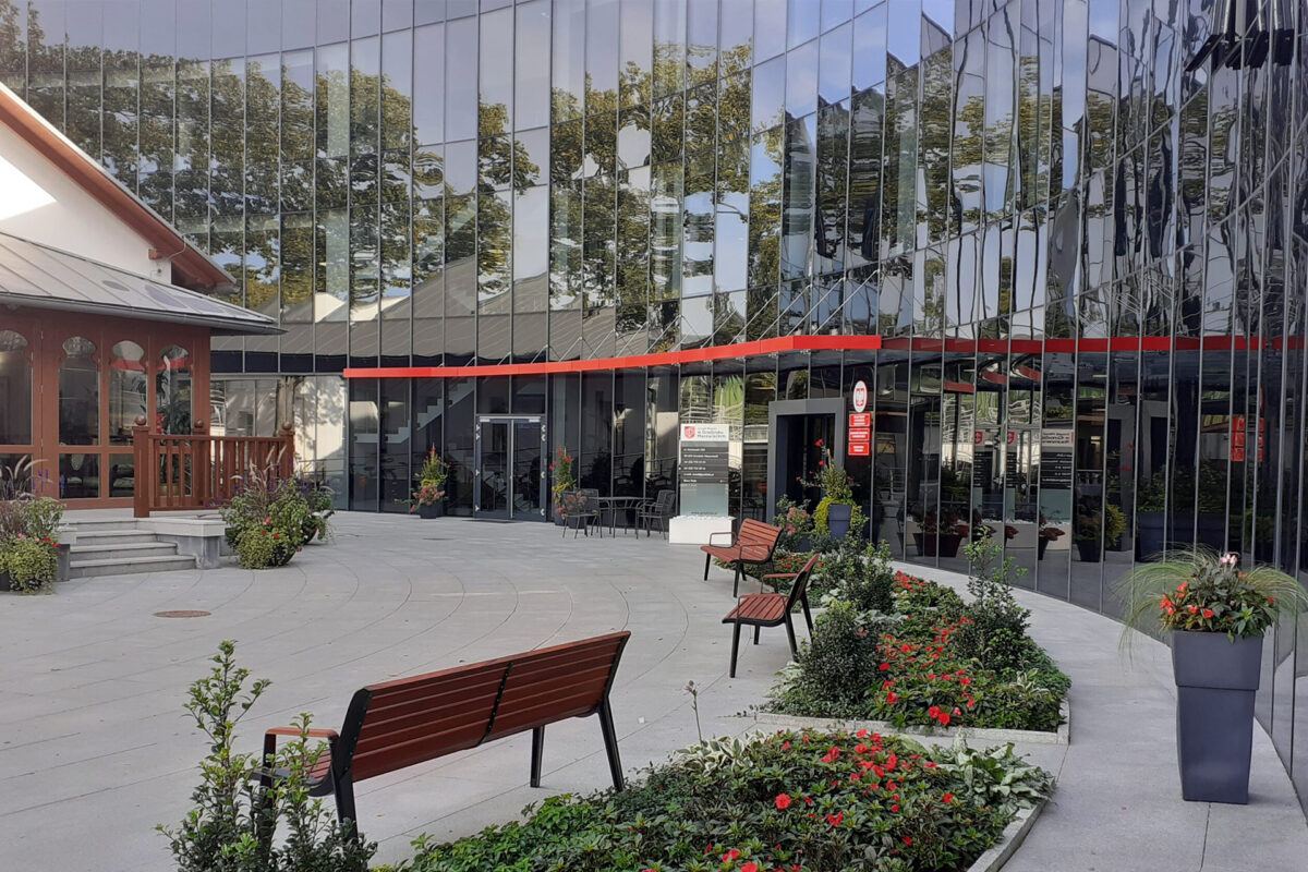 Opis obiektu: Wybudowany obiekt to IV kondygnacyjny budynek użyteczności publicznej, częściowo podpiwniczony, z nadbudówką techniczną. Budynek w kształcie rozwartej litery L od strony dziedzińca osłonięty przeszkloną ścianą słupowo ryglową w kształcie łuku okalającego zabytkowy budynek willi “Niespodzianka”. Budynek wykonano w technologii konstrukcji żelbetowej ze stropodachem płaskim krytym papą z posypką. Front budynku, wejście od strony zachodniej, zadaszone.