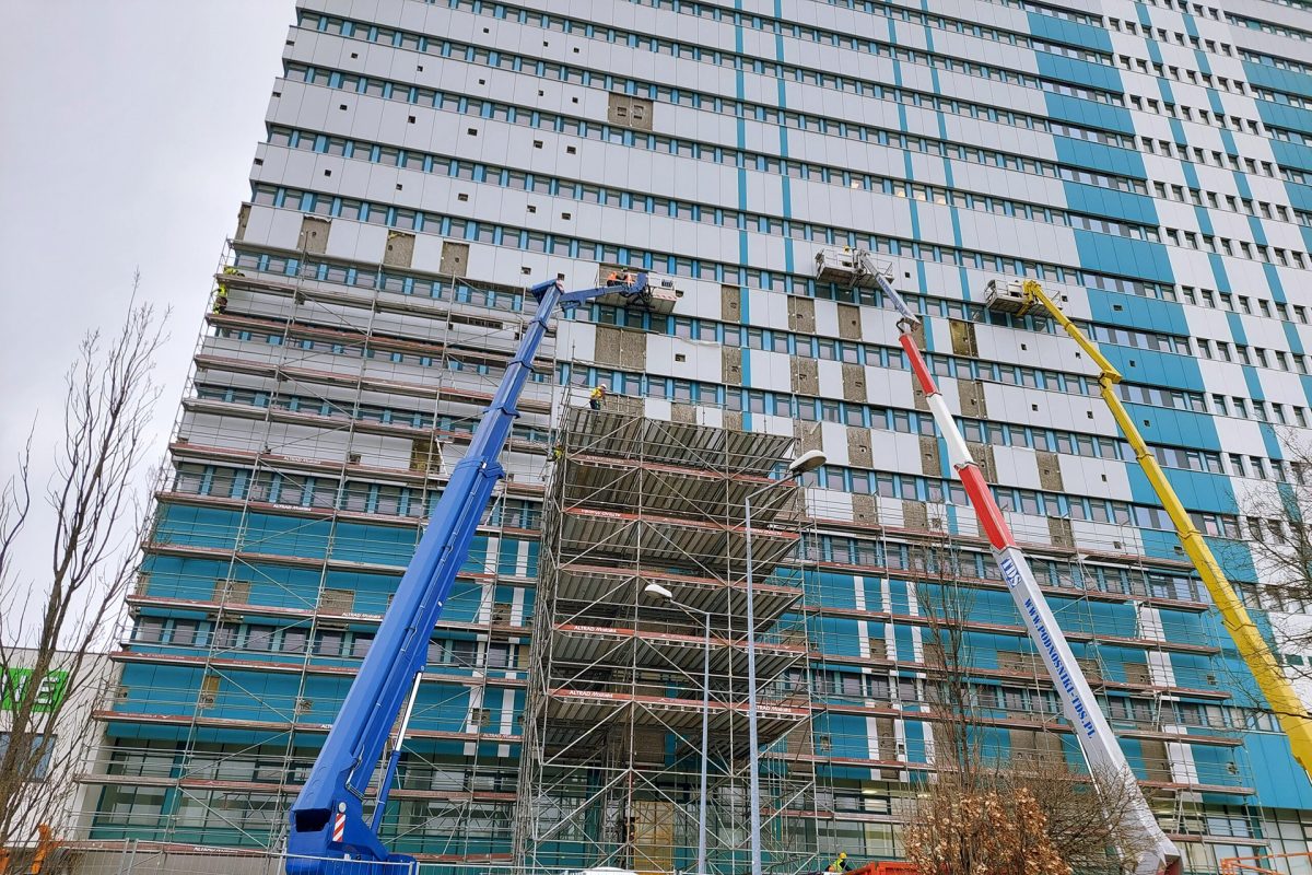 Głęboka termomodernizacja, całość fasady budynku A1 od kondygnacji P02 (wraz z wyburzeniem i montażem nowych schodów i zadaszenia dla wszystkich wejść. Roboty budowlane obejmują swoim zakresem również termomodernizacją ścian fundamentowych do wymaganego poziomu.