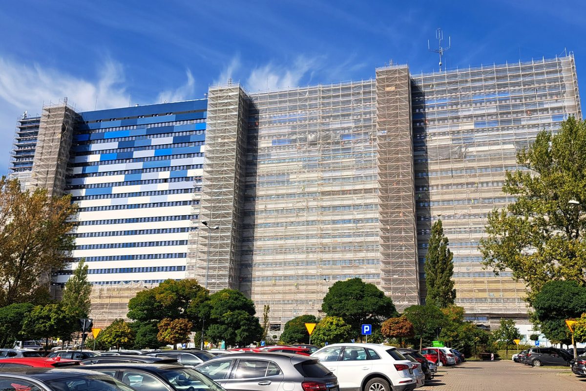 Zamówieniem objęta jest całość fasady budynku A1 od kondygnacji P02 (wraz z wyburzeniem i montażem nowych schodów i zadaszenia dla wszystkich wejść do P18 , w zakresie ścian: zachodniej, południowej, wschodniej z wyłączeniem części niskiej budynku od strony zachodniej. Część niska przylegająca do budynku A1 będzie realizowana w części wschodniej, łącznie z poziomem dachu. Roboty budowlane obejmują swoim zakresem również termomodernizacją ścian fundamentowych do wymaganego poziomu.