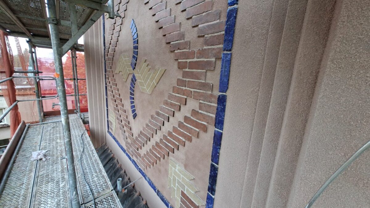 - scalanie kolorystyczne sgraffiti pod arkadami i mozaiki na elewacji północnej