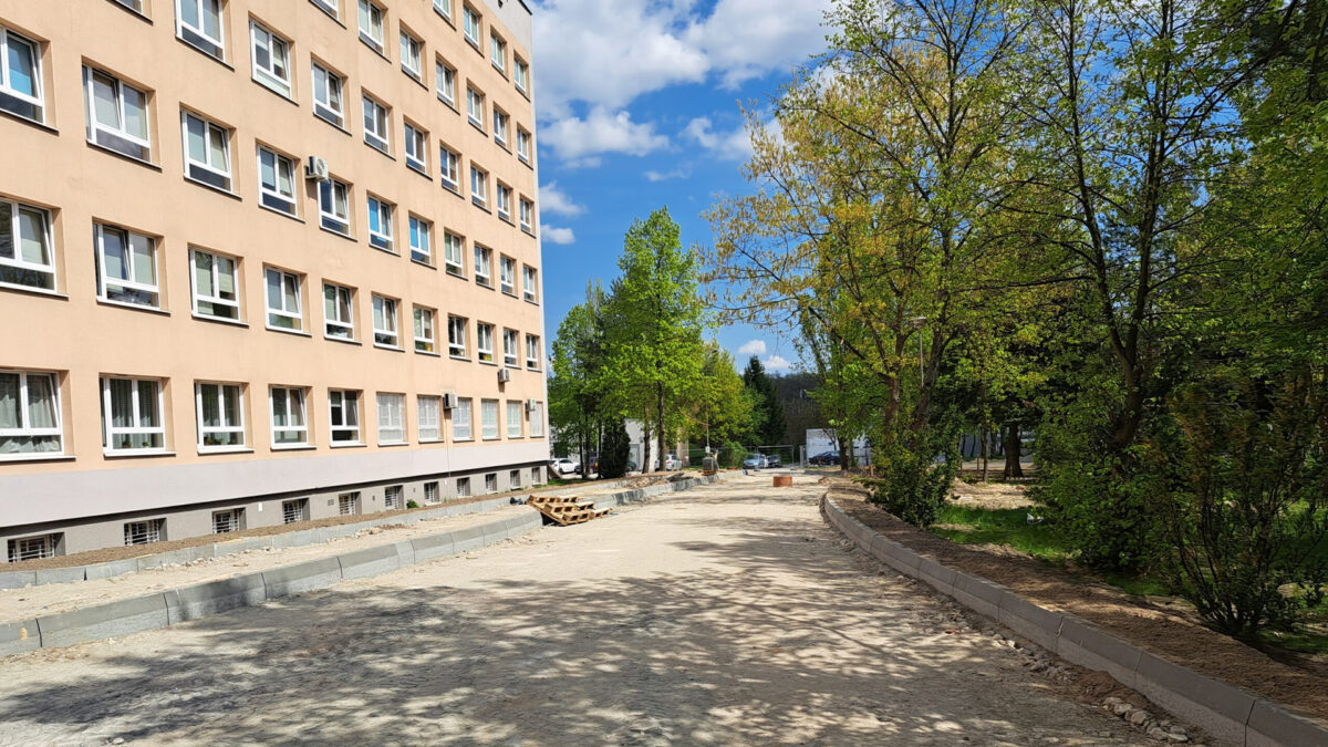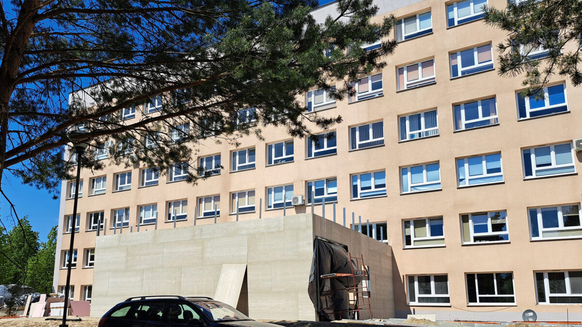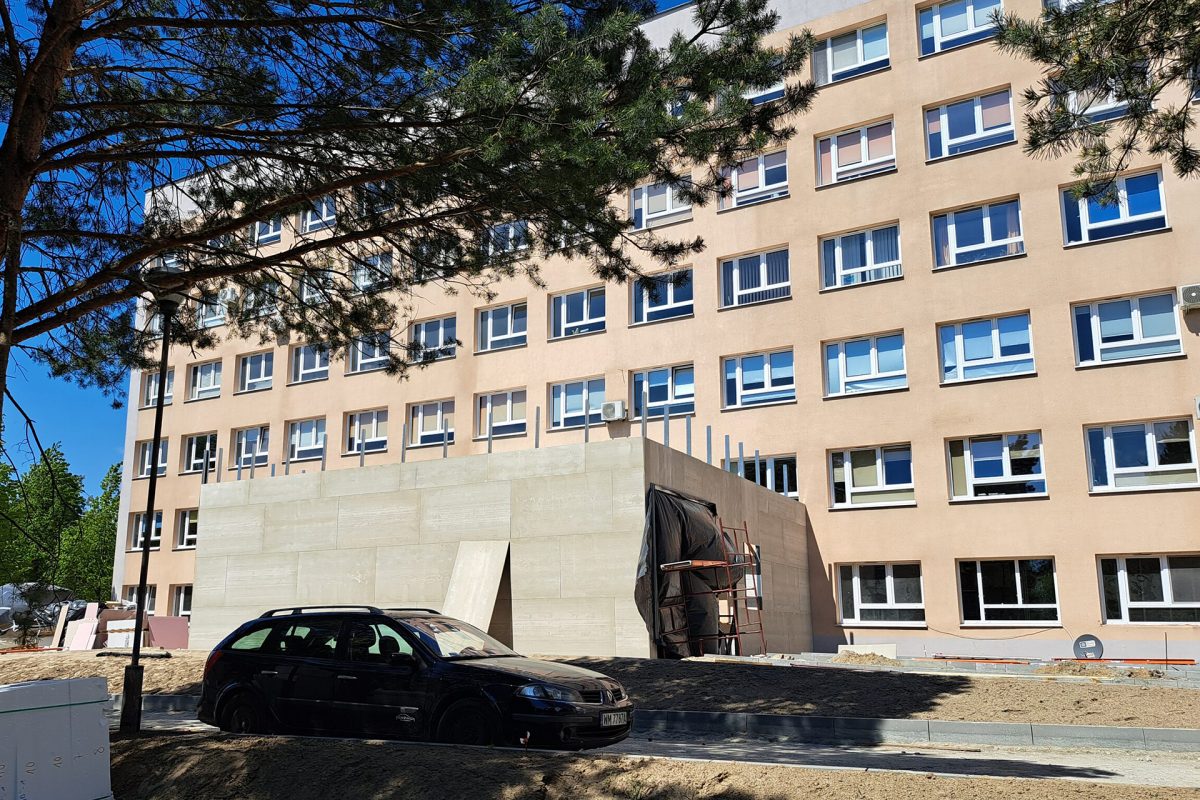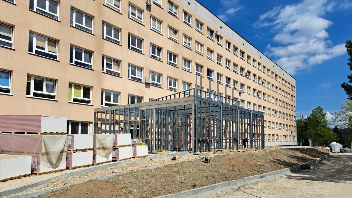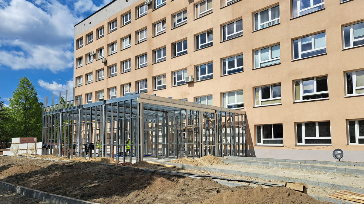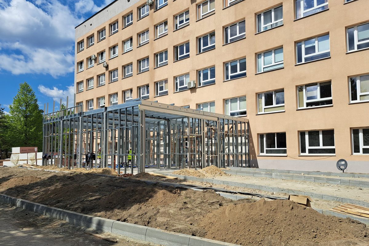 Obecnie stawiane są nowe ścianki działowe w istniejącym budynku szpitala, stawiany jest dodatkowy podjazd dla karetek z konstrukcji szkieletowej, trwają prace brukarskie oraz instalacyjne zewnętrzne (kanalizacji deszczowej oraz elektryczne) i wewnętrzne wszystkich branż. Termin wykonania zadania inwestycyjnego jest ustalony na 26.09.2023 r.